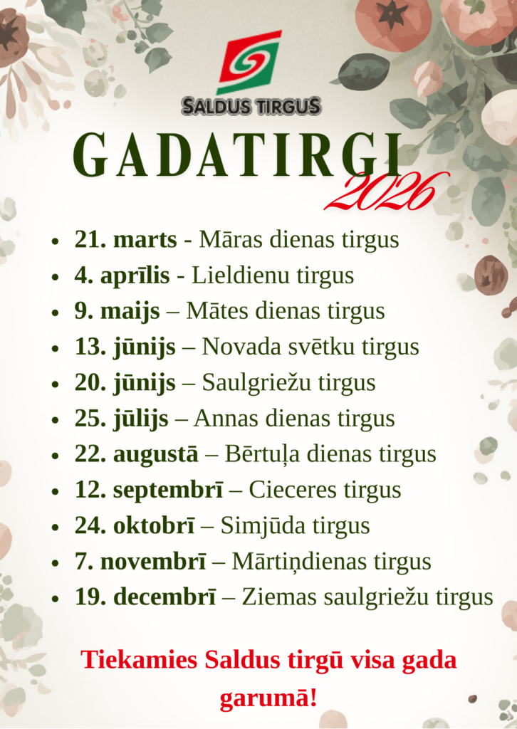 Saldū arī 2026. gadā turpinām skaisto tradīciju – visa gada garumā rīkojam tematiskos gadatirgus, kuros pulcējas vietējie mājražotāji, amatnieki, zemnieki un tirgotāji no tuvākas un tālākas apkārtnes.