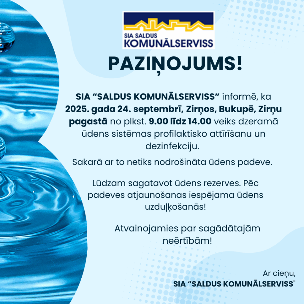 Profilaktiskā ūdens sistēmas dezinfekcija Zirņos, Bukupē, Zirņu pagastā 24.09.2025.