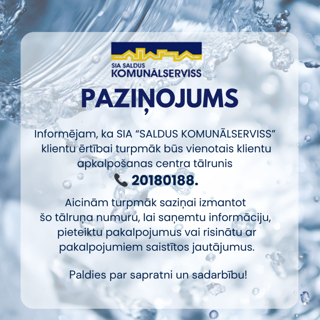 SIA SALDUS KOMUNĀLSERVISS klientu ērtībai turpmāk būs vienotais klientu apkalpošanas centra tālrunis: 20180188